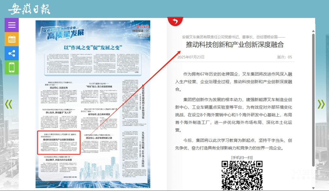 展望未來,安徽叉車集團將在省委省政府的堅強領導下,切實增強使命感和責任感,持續加大在關鍵技術攻關方面的投入力度,加快企業的高端化、智能化、綠色化轉型步伐。同時,集團將進一步拓展海外業務布局,堅持 “干” 字當頭,創新爭優,致力于打造具有全球影響力和競爭力的世界一流企業,為安徽在中國式現代化進程中貢獻更強大的合力,書寫更為輝煌的篇章。
