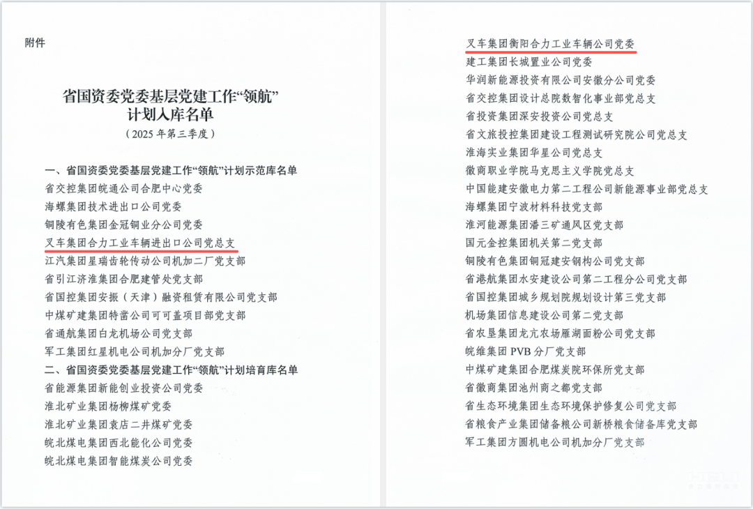 日前,安徽省國資委黨委印發(fā)2025年第三季度基層黨建工作“領(lǐng)航”計劃入庫情況的通報,省屬企業(yè)共有10個基層黨組織入選其示范庫,28個基層黨組織入選其培育庫。其中,安徽叉車集團進出口公司黨總支憑借“同心合力 全球爭先”黨建品牌成功入選示范庫,衡陽合力黨委憑借“紅雁”黨建品牌成功入選培育庫。